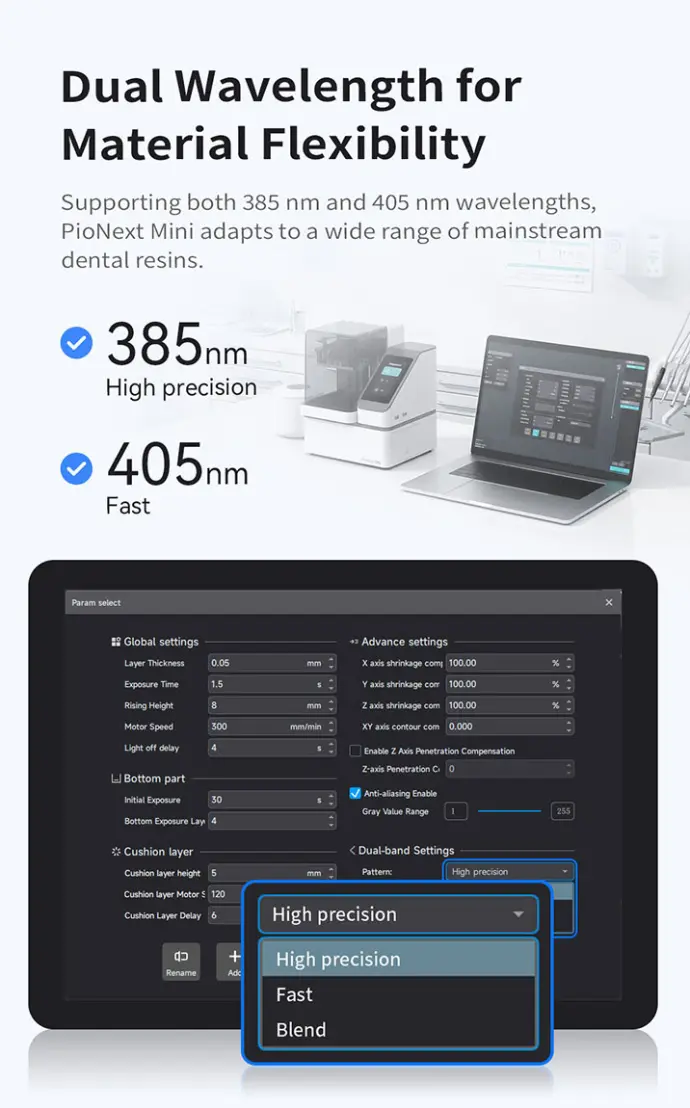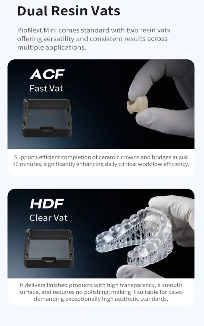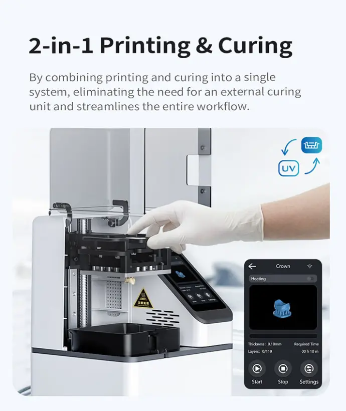 Mini es una solución compacta e integral de impresión 3D dental que combina una impresión rápida y precisa con un curado integrado. Diseñada para ser portátil y para uso diario en la consulta, ofrece una amplia compatibilidad de materiales, resultados consistentes y flujos de trabajo clínicos eficientes.